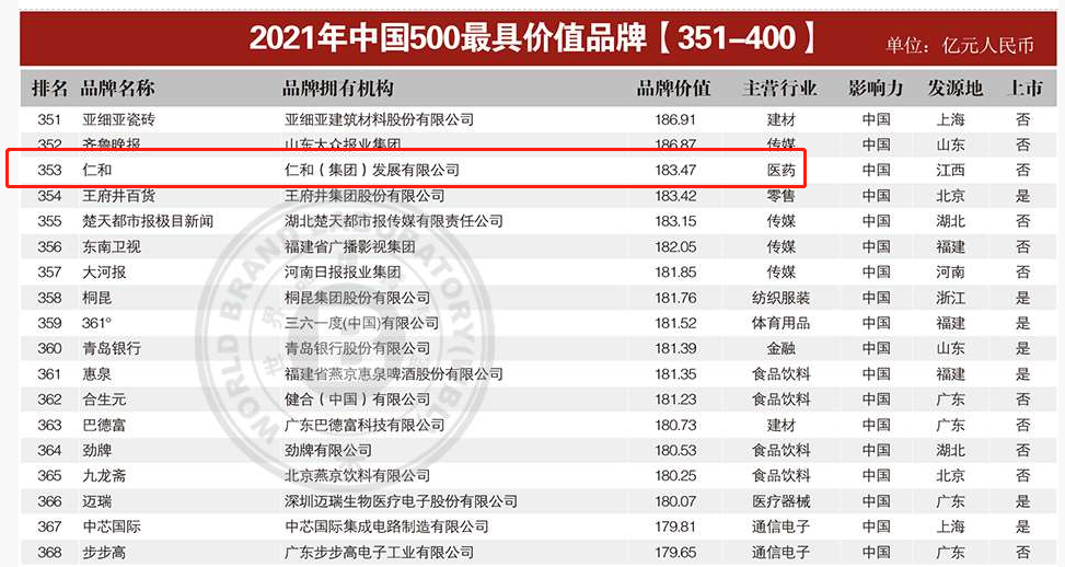 仁和品牌連續(xù)十五年入選中國500最具價(jià)值品牌榜