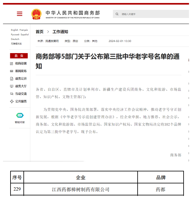 2024年2月1日下午,由商務部、文化和旅游部、市場監管總局、國家知識產權局、國家文物局五部門聯合發文公布了382個品牌認定為第三批中華老字號。仁和集團旗下“藥都”品牌位列其中。據悉,此次江西共認定13個中華老字號,“藥都”是唯一一個江西省醫藥品牌中華老字號。