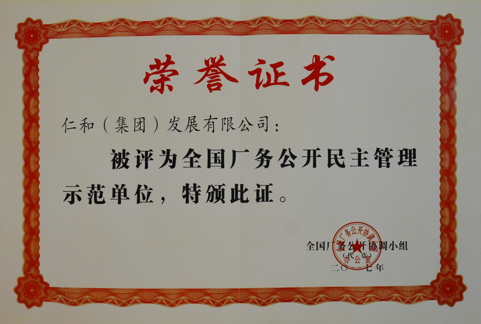 2017年全國廠務公開民主管理示范單位 榮譽證書 發布時間: 2019年12月18日 14:57:50 閱讀量: 9,727 下一篇:仁和集團榮膺“全國廠務公開民主管理示范單位”上一篇:集團榮獲2017年中國制藥工業百強